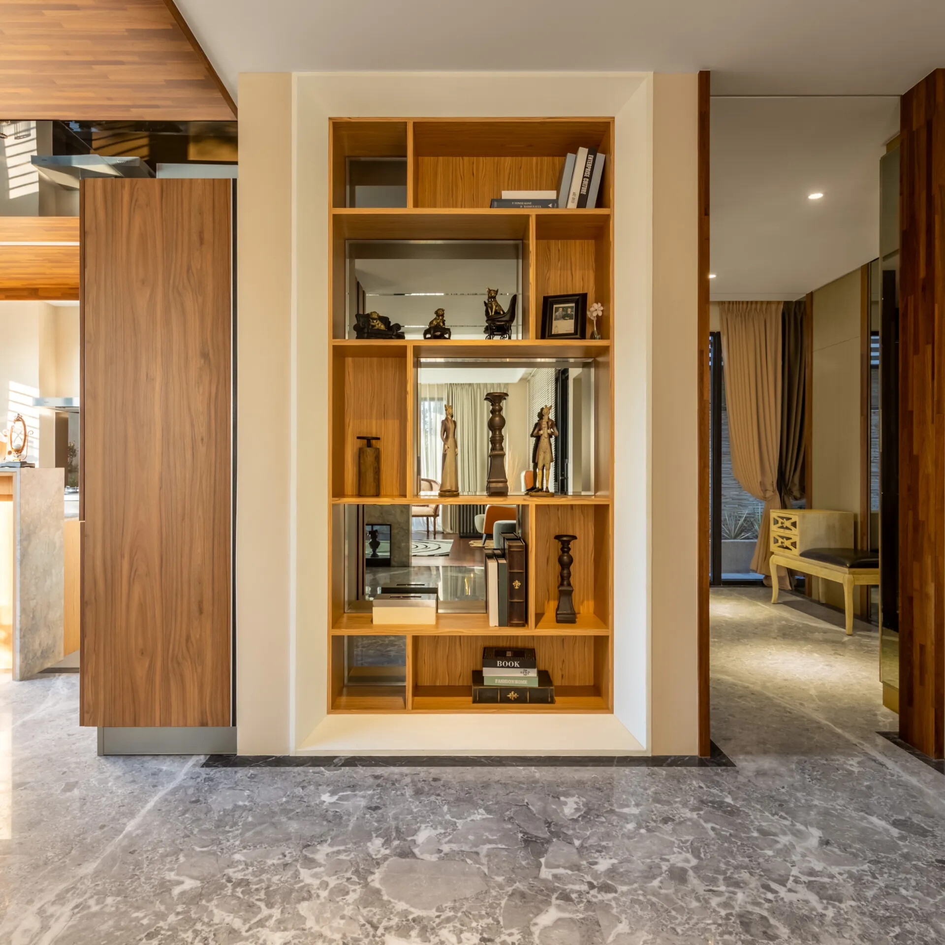 鑒於本案業主有風水上的考量,因此在場域格局的劃分,團隊皆有遵循風水的基本原則進行擘劃,讓住宅不僅美觀,還能為業主一家帶來好運。除了妥善的格局劃分之外,還有利用格柵設計作為場域界定,化解穿堂煞的同時,也能維持空間的寬敞、通亮。